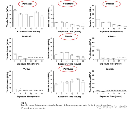结论——材料在体外酶溶液中迅速退化同样在体内也会有相同的反应,特别是暴露在创伤的组织环境下,此处基质金属蛋白酶水平明显提高。Permacol,CollaMend,Strattice,FlexHD,PeriGuard经受了最长的30小时酶溶液的作用并且仍能完成机械性能测试(其它材料都已经退化变质了)。